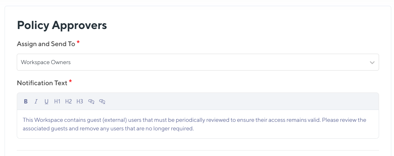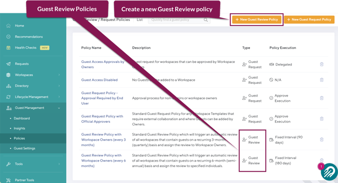 Guest review policies allow your organization to enforce periodic reviews of workspaces have have guest members.