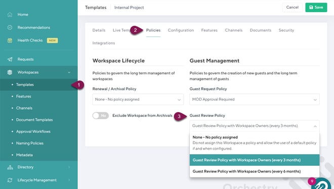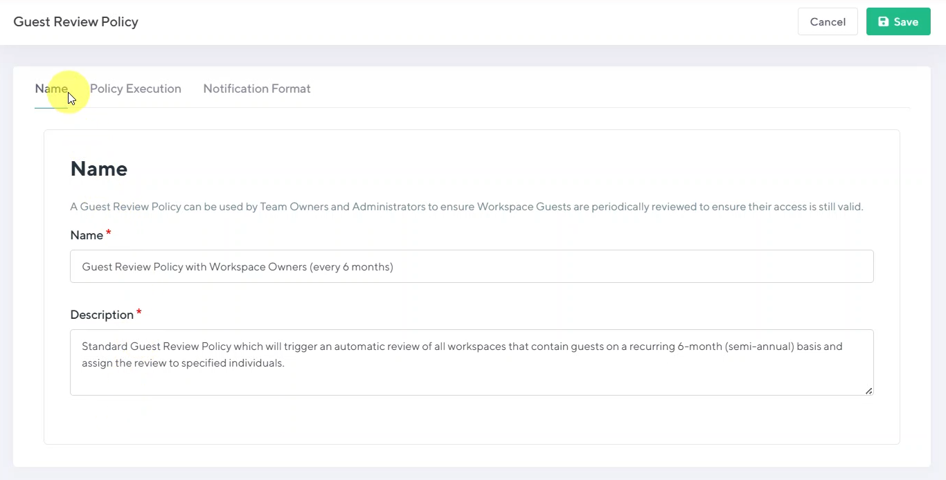 Your new policy can then be assigned to any existing workspace of the same type (i.e.: teams workspace). You can also proactively assign guest review policies by attaching them to your workspace templates.
