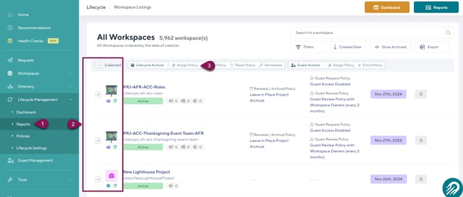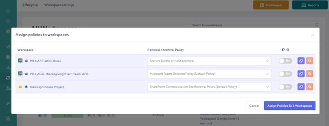 You can assign archival policies to one or multiple workspaces from the Lifecycle Management 'Reports' page.