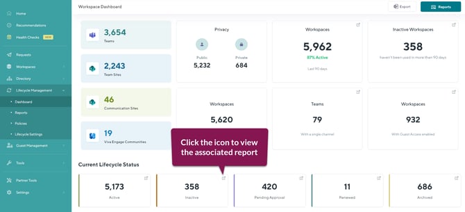 Any tiles with an icon on the top-right are linked to existing Workspace reports in Orchestry. Clicking this icon will take you to the workspace 'Reports' page where you can view the data in more detail and take appropriate actions.