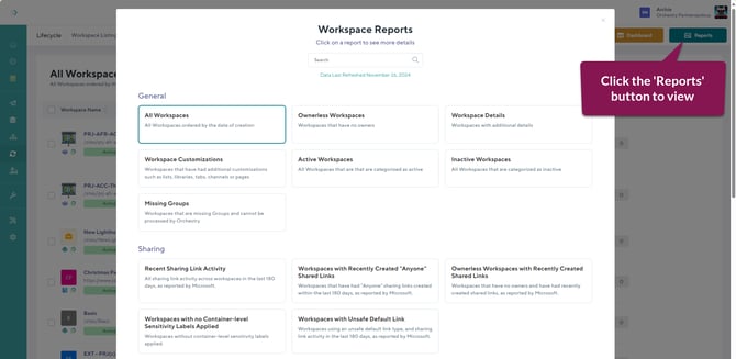 Clicking on the 'Reports' button will show you more of the workspace reports built into Orchestry.