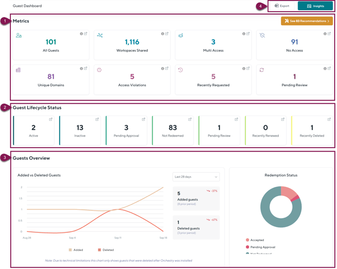 | 3. Guests Overview | Graphical representations of guests that have been added and deleted from your tenant over a period of time. You can change the scope of the data to view data over the past 7 days, 28 days or 365 days. The 'Redemption Status' chart shows how many guests have accepted their workspace invitations, how many are pending approval, and how many have not redeemed their invite. |