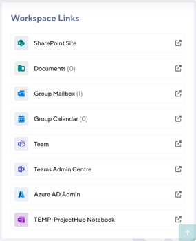 This section allows you to quickly access the different areas of this workspace, such as the SharePoint site, team, Viva Engage community, group inbox, group calendar and more.